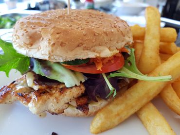 Choice of beef patty with bacon & egg or veggie burger, or marinated grilled chicken in a bun with salad and a side serve of chips